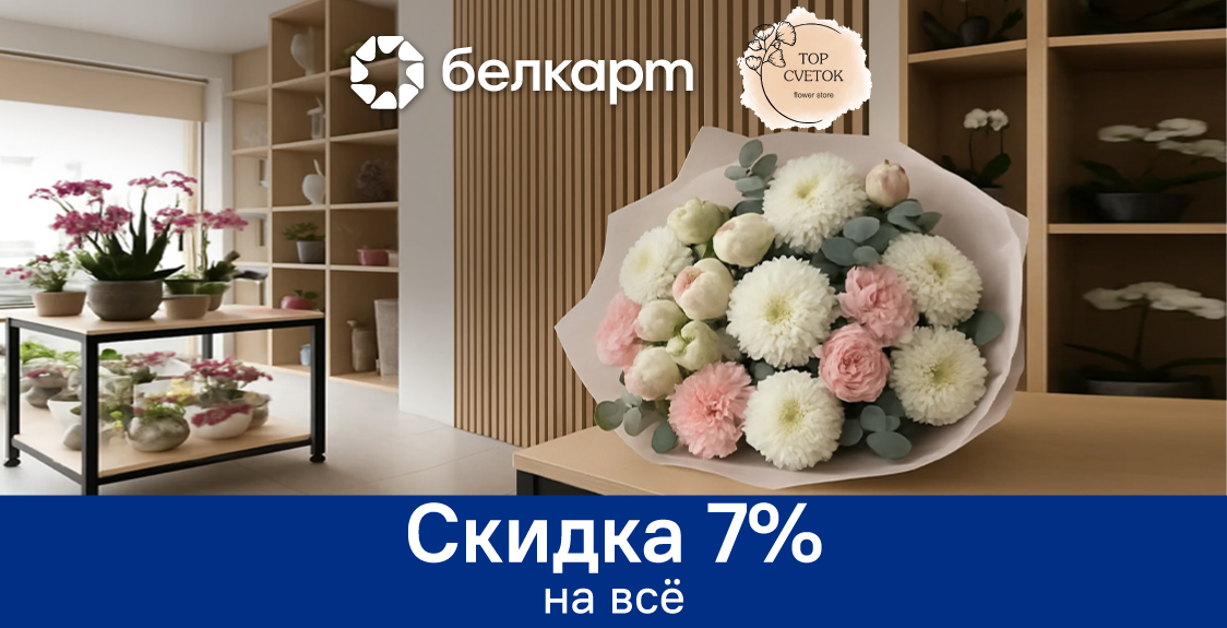 АктивнаСкидка 7% в интернет-магазин цветов TopCvetok.byС 12.02.2026 г. по 31.01.2027 г. -